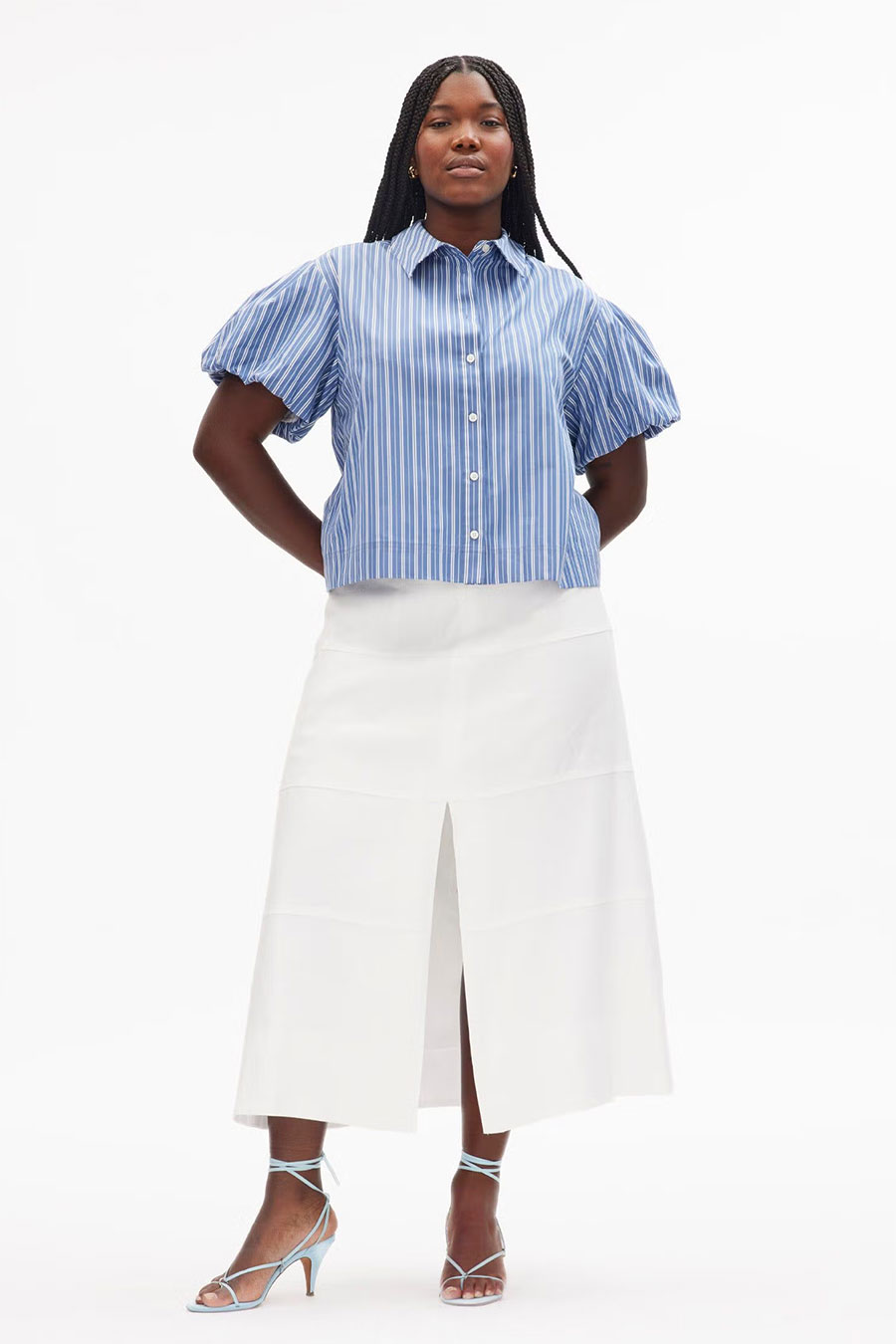 A white A-line midi skirt is paired with a blue and white striped shirt with dramatic bubble sleeves. The white stripe matches the white skirt. The shirt is worn loosely over the skirt because the shorter length creates attractive proportions. Light blue strappy heels are the dressy shoes of choice. Although very pretty, they can be uncomfortable. I see comfy and pretty silver sandals or wedges instead. Add a bag that works with the palette.