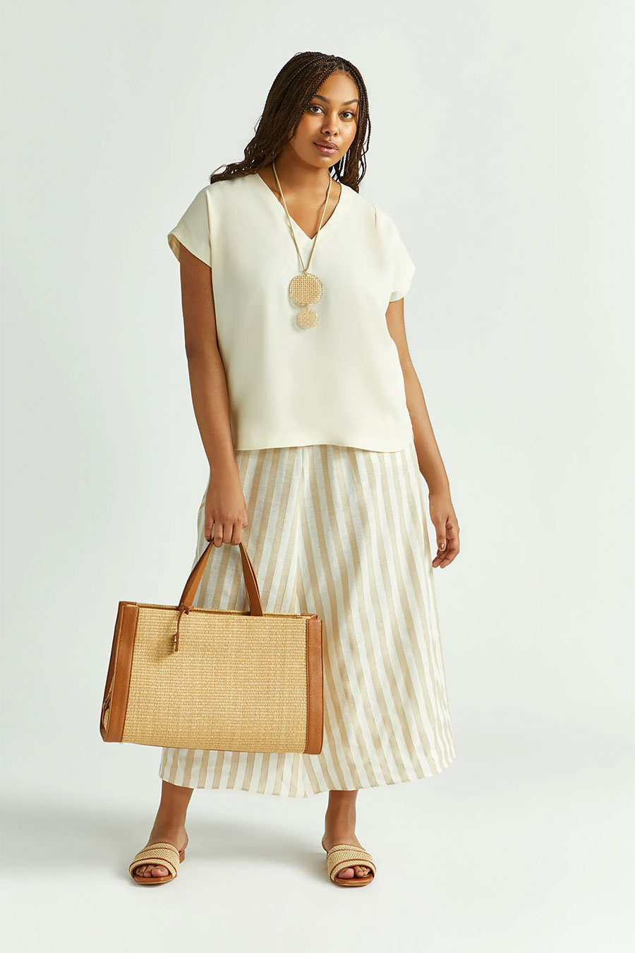 Last, a boxy and fluid V-neck cream cap sleeve shell top is worn un-tucked over a flared cream and tan striped skirt. Tan and cognac sides are the casual shoe of choice. The tote matches the slides, as does the earthy neclace. Pretty, polished, breezy, and relaxed. Add eyewear, hat and watch as desired.