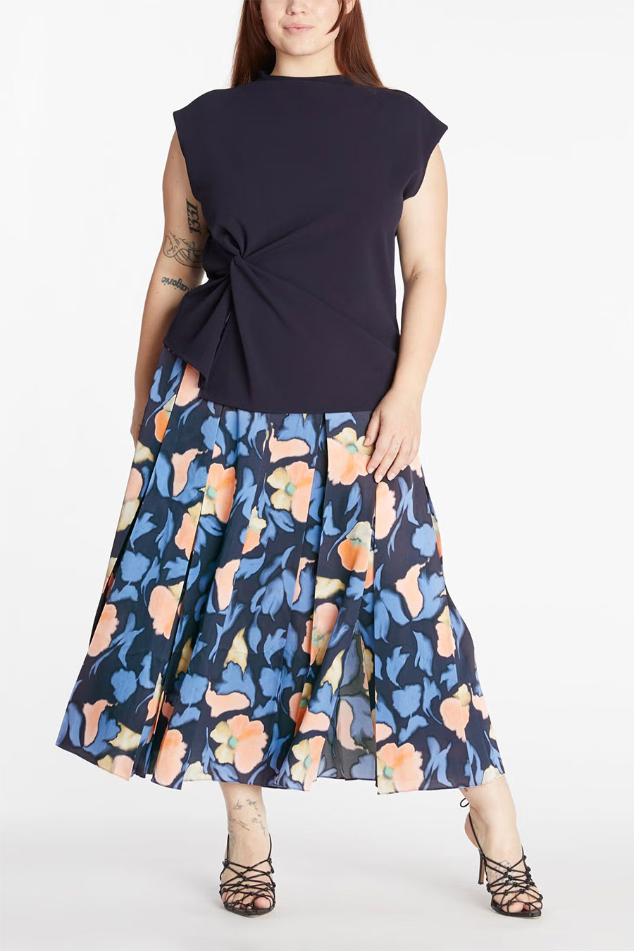 A navy top with grown-on sleeves and asymmetrical front knot detailing is worn over a box- pleated floral midi skirt. The navy in the pattern matches the top. The waist definition of the top adds structure to the outfit, which tempers the longer length of the top, and volume of the skirt. Comfortable navy sandals, ballet flats, mules, wedges, or ankle strap flats are a more comfortable footwear choice than the strappy sandals. Add a bag that works with the palette.