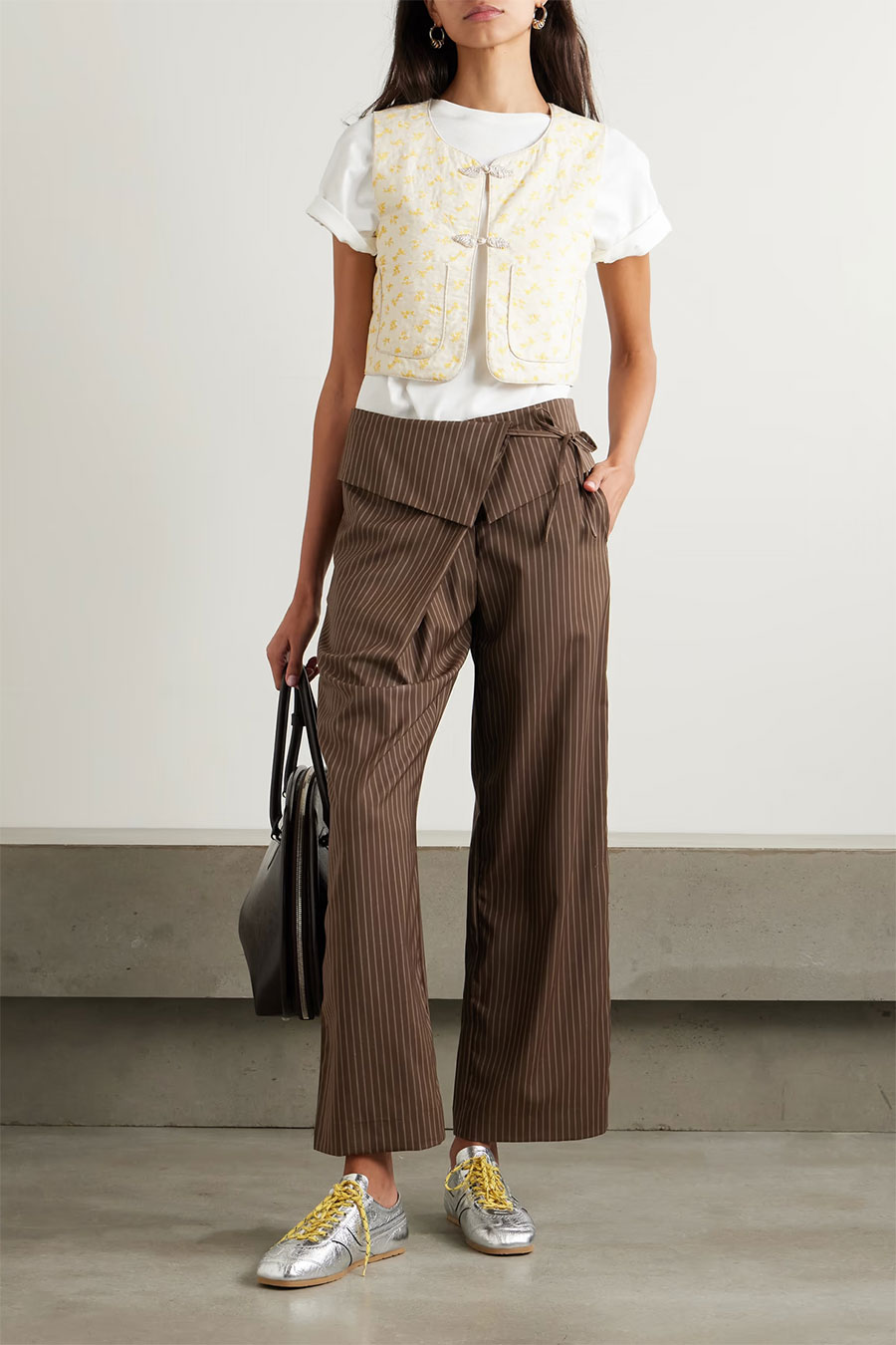 Last, an outfit that incorporates a range of vibes. A casual white tee is paired with a dressy and avant-guard pair of pinstriped brown wide crops. A quilted and embroidered waistcoat with a bo-ho light vibe is worn as a third piece. Sporty silver sneakers add a casual touch. A bowling bag throws in some modern retro. Add jewellery and watch as desired.