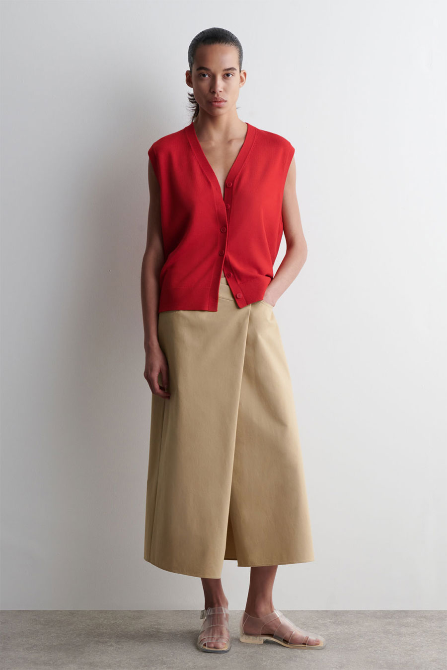 Waistcoats can be knitted and less fitted like the slouchier one shown here. It’s buttoned through like a top with a few left unbuttoned at the bottom to create the visual effect of a slit on the welt. The red knitted waistcoat is paired with a toffee A-line midi skirt. Jellies are the finishing touch as footwear. I see an earthy bag complete the look.