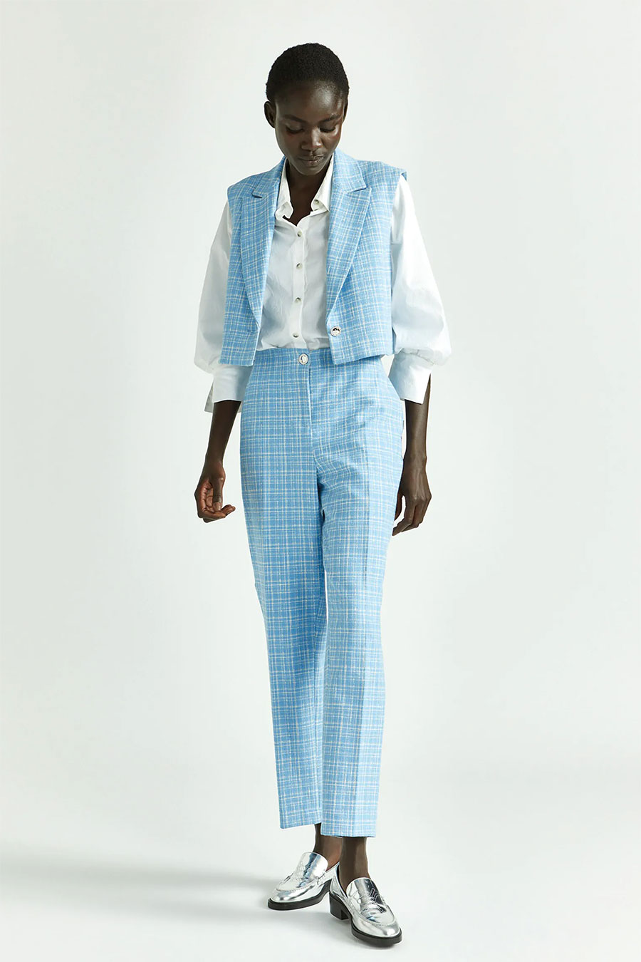 This is a dressier waistcoat and pants set in a Spring tweed. The set is separated by a white blouse that picks up the white of the tweed. Chunky statement silver loafers are the chunky shoe of choice. Their black soles bookend the model’s hair. I see a silver or white bag complete the look.