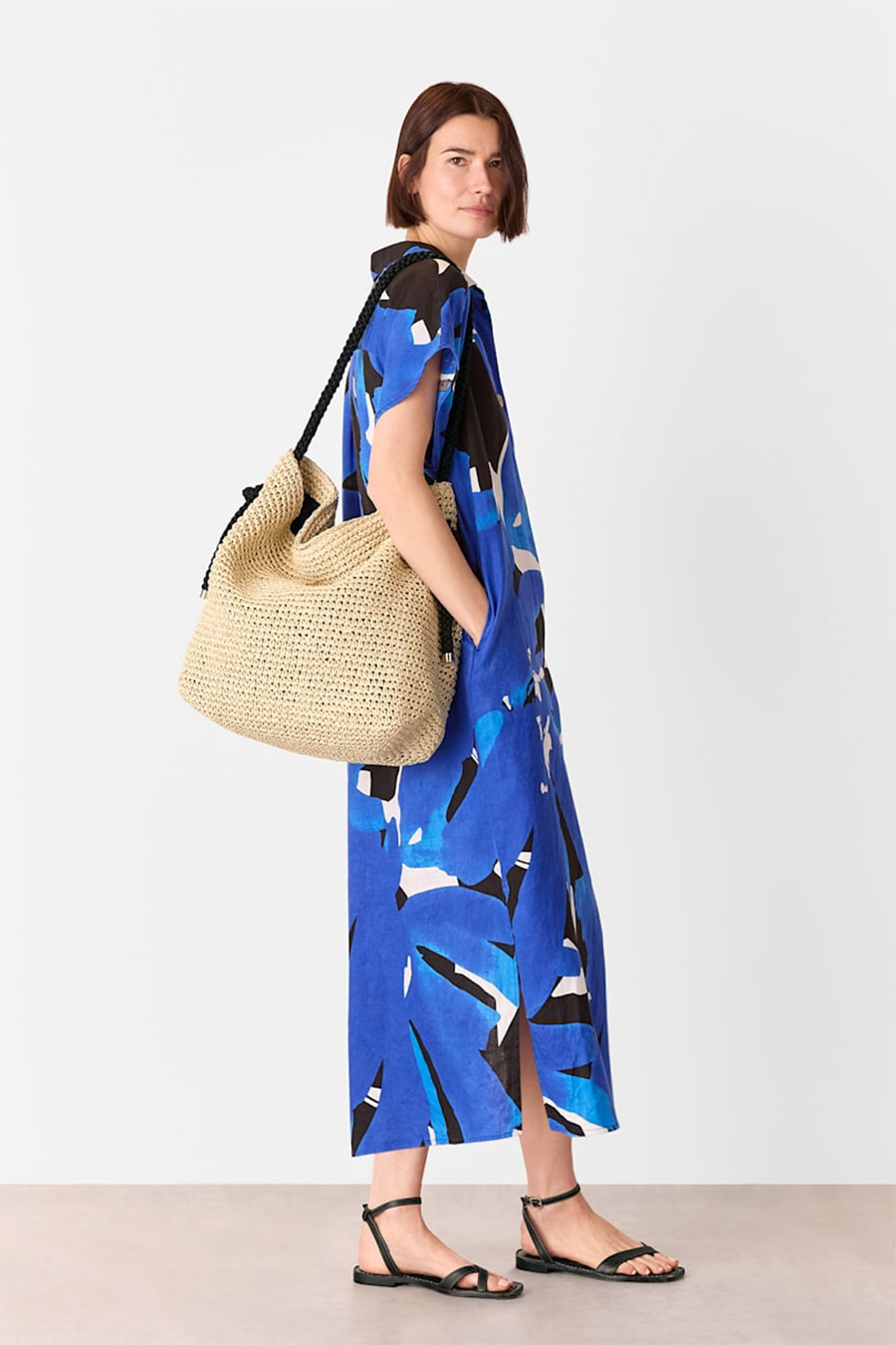 A sapphire blue patterned and unstructured midaxi shirtdress is worn as a comfy and breezy sack. Flat black ankle strap sandals pick up the black in the pattern, work with the model’s dark hair, and accentuate the casual integrity of the outfit. A beachy straw bag further dresses down the look. Its black strap works well with the shoes.