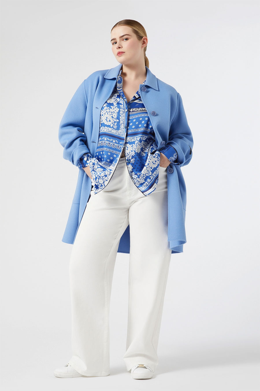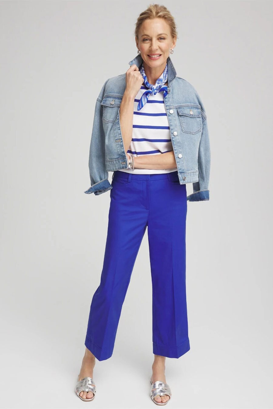 If you like the idea of wearing non-neutral bottoms, a pair of sapphire trousers or a skirt are an option. Here, bight blue wide cropped pants are paired with a blue and white tucked tee. A blue and white neckerchief in the same palette adds a pattern mixed effect. A light wash denim jacket with silver buttons tops the lot. The silver buttons match the silver slides and the hoop earrings. Add a bag, watch and eyewear as desired.