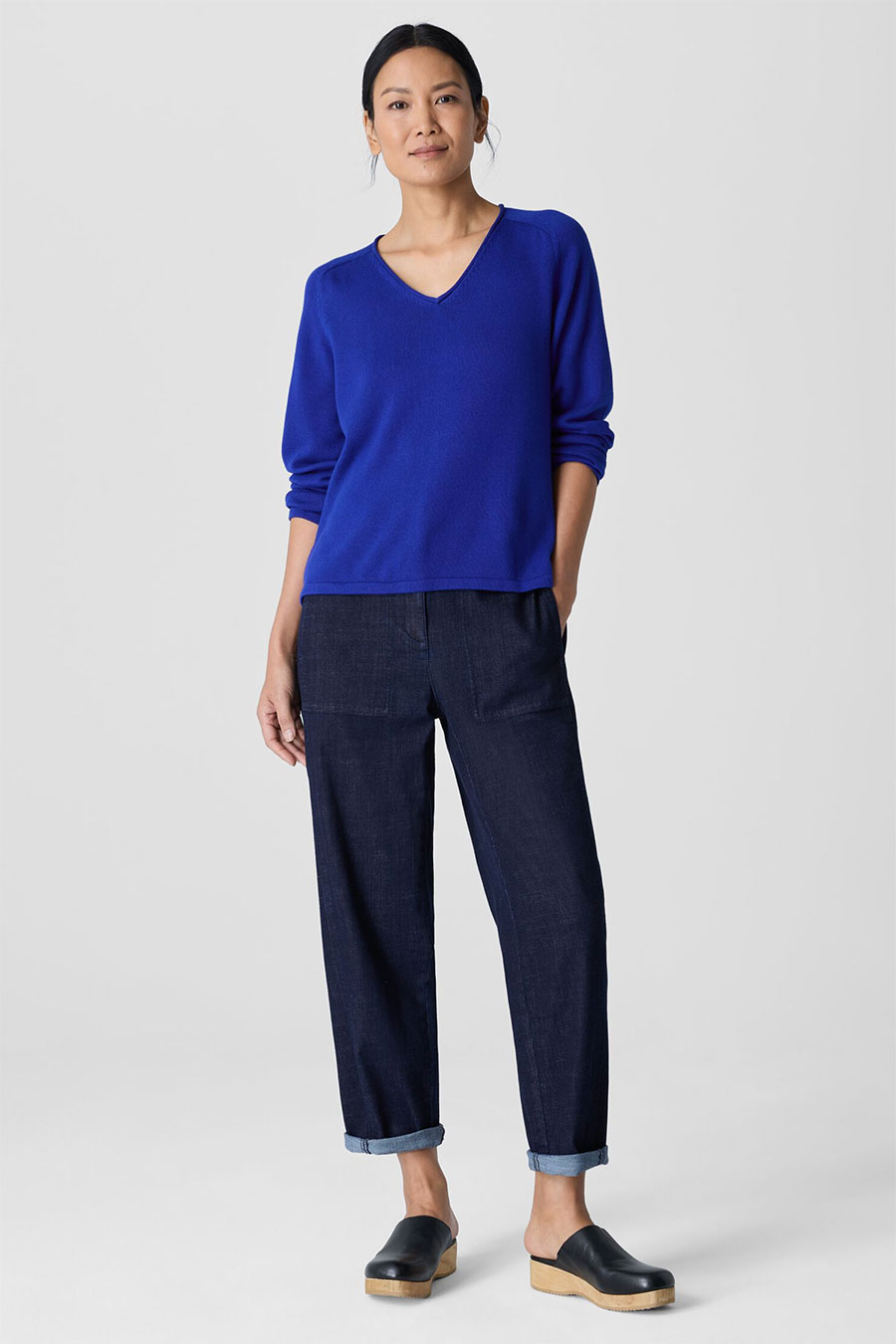 A sapphire top is an easy way to wear the intense shade of blue. Wearing it with dark or light wash jeans works well. Black bottoms work well too. Here a fluid sapphire V-neck top is paired with dark wash jeans in a gentle lantern silhouette. The sleeves are scrunched for outfit texture and to showcase some skin. The jeans are rolled to showcase more of the ankles. Black clogs match the models hair. Add a black bag to match.