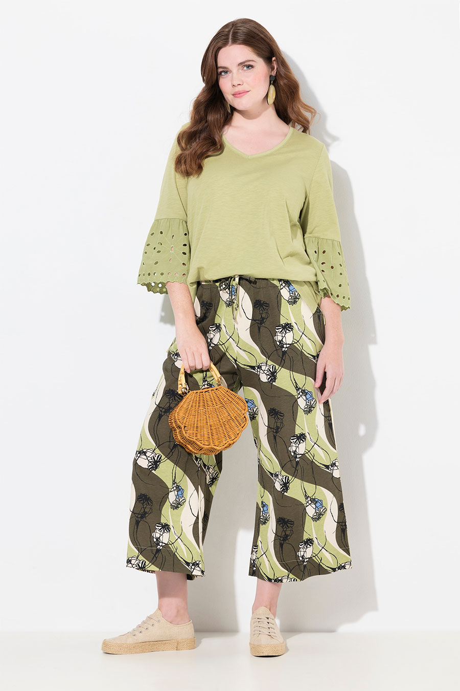 Floral pants are a festive way to mix things up for Summer. Here, an abstract spaced floral motif is combined with a swirly background design to create a maximal pattern in earthy greens, white, black, and a bit of blue. A seaweed green tee with eyelet sleeves is tucked into the floral pants. Ecru sneakers are the casual shoes of choice. A wicker bag in the shape of a shell adds a darling beachy touch.