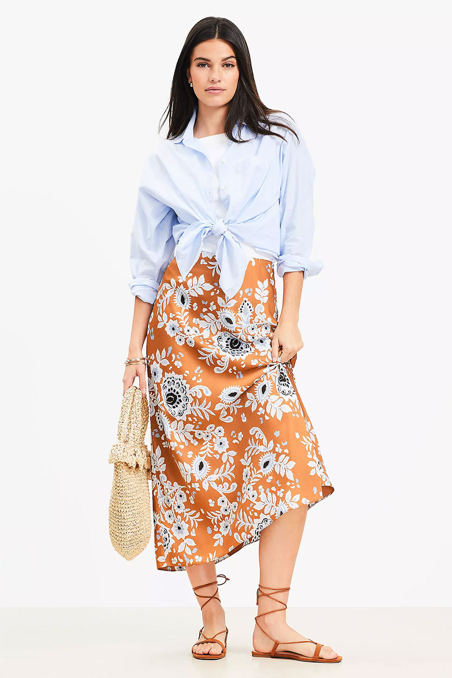 Last, a cinnamon midi skirt with a white, light blue, and navy spaced floral design is combined with a tucked white tank top. An oversized light blue shirt is layered over the tank and tied in front to shorten the length and create waist definition. The sleeves are rolled to showcase forearm skin. Flat cognac sandals dress down the shine of the skirt. The straw bag adds another relaxed touch. Add jewellery, eyewear, hat, and watch as desired.