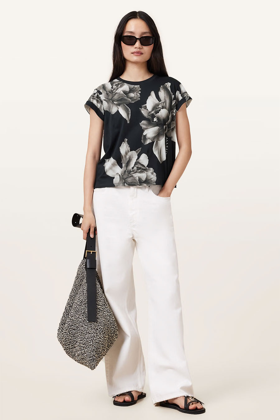 A fluid printed spaced floral tee in black, white and grey is worn over a pair of full length slouchy and wide white jeans. Flat black sandals match the tee, the sunnies, and the model’s hair. A grey and black tweed bag adds texture and a subtle form of pattern mix. Its black strap matches the sandals.
