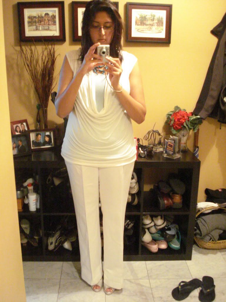 And, was going through some old storage boxes yesterday and found this slightly off-white cowl neck tunic length tissue T that I bought two summers ago and hardly ever wore. I think it looks nice with a simple cami underneath. I wore a light baby blue cami but what other colour combinations would you girls suggest?