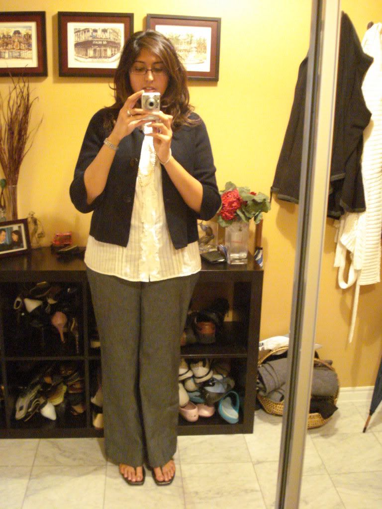 I'm also wearing a sleeveless BR white ruffled blouse although I don't think you can really see the ruffles in the pic, and my navy jcrew 3/4 sleeve cotton jacket on top.