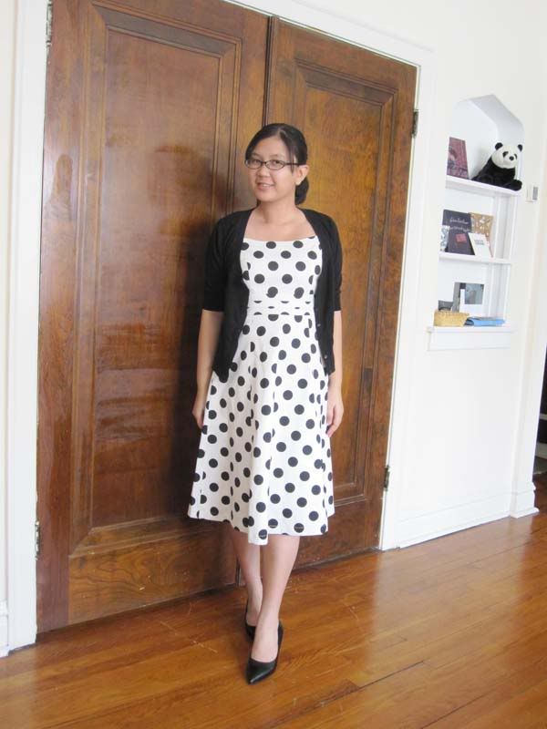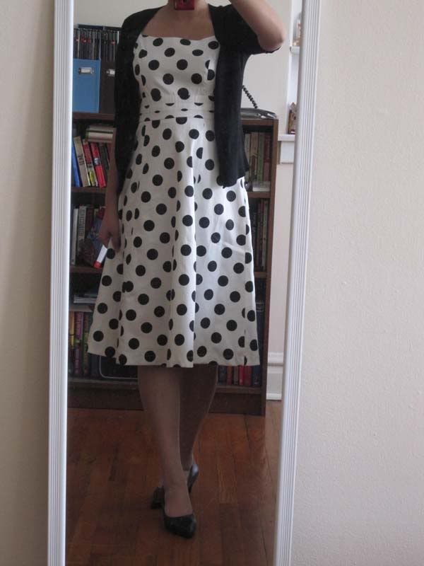 the only thing is, i'm now wondering if the print is too large for me? and also if it's too long -- just because my sweet spot is usually just about at the knee. does it look like i'm drowning? should i have it shortened? the outfit looks a little boring, but i just tossed on that cardi to break up the dottiness, and those shoes were another target gift card buy -- just because i needed basic black pumps!