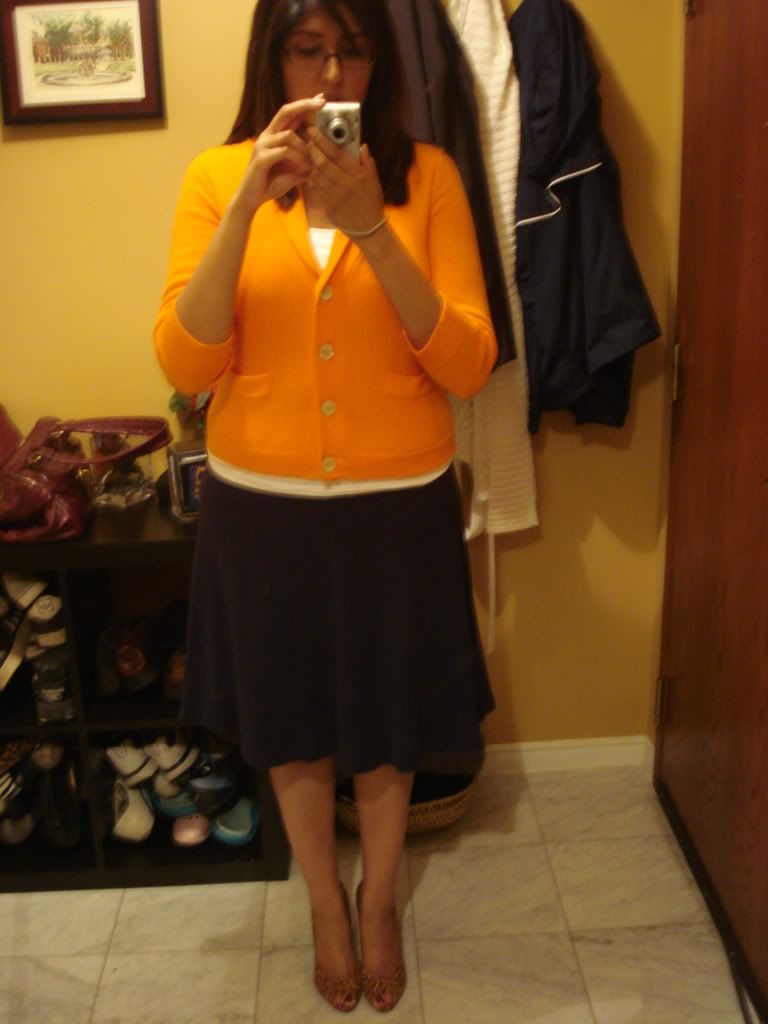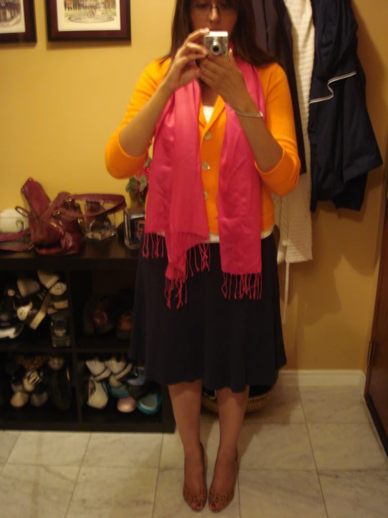 And, since I normally always bring a pashmina with me everywhere (with AC blasting on indoors I normally need it!) - here is my outfit for today with my new hot pink pashmina. I really like the orange and hot pink together. Thanks to Mirah who suggested the combination!