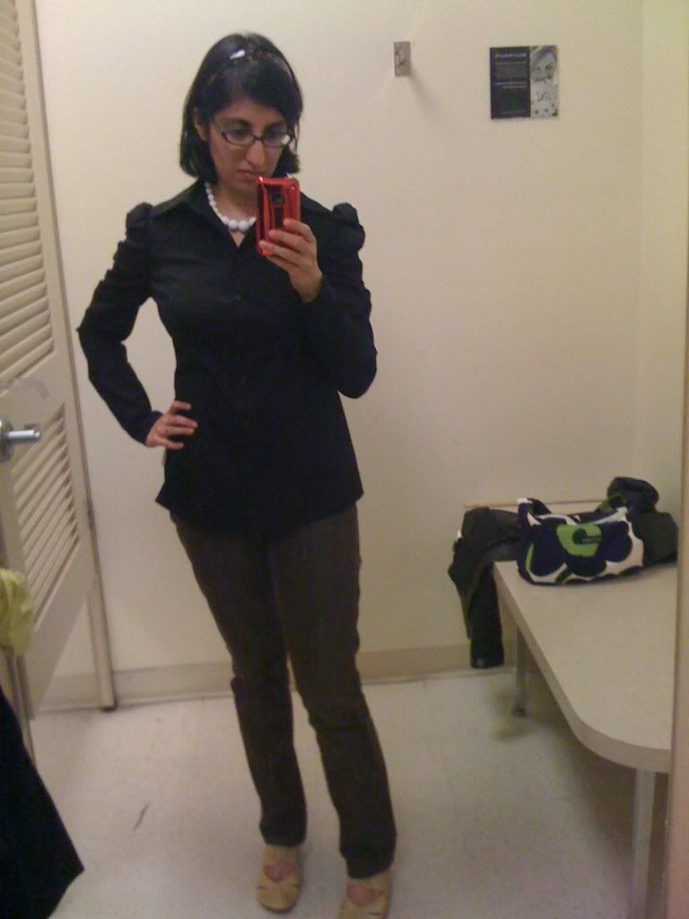 Black buttondown with long ruched sleeves. It is from the INC department and was on the sale rack for $20-something...don't remember exactly. I need a 2.