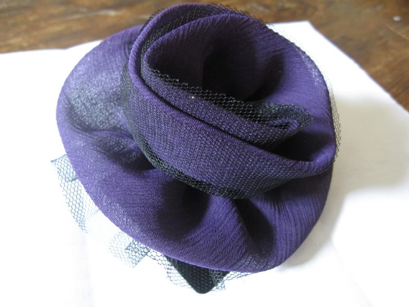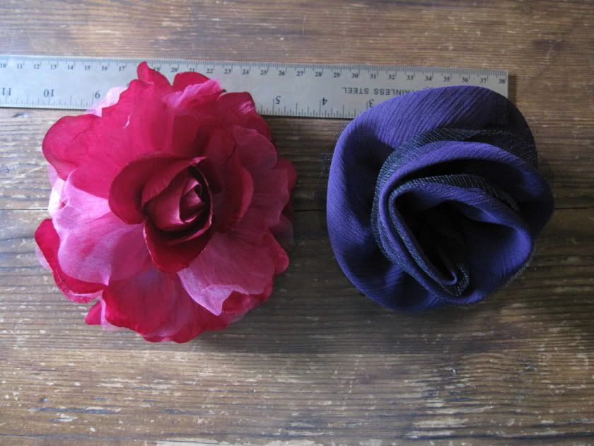 There are two, one deep, true purple and one fuchsia. Purple is more abstract and fuchsia is a classic silk flower. Ruler in background shows size: purple is about 3.5 inches and fuchsia slightly bigger. Fuchsia does not have the black accents that Angie had suggested, but the purple has a layer of black tulle behind it that you can see in the picture of it by itself: