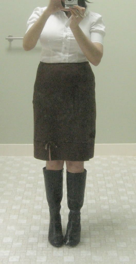 If I were going to an interview at J. Crew, I would wear my bright orange/red pants, grey heels, grey and white striped knit top, and some kind of jacket over the top, probably the dark blue denim one. I'd also wear a cuff bracelet. Or, I'd wear my denim pencil skirt, nude microfishnet stockings, cream button down and the orange tweed jacket layered over it with a cognac skinny belt. Not sure which shoes I'd go with, I'd have to think about that.