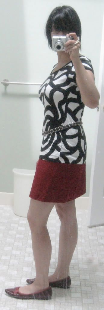 -A chain belt. Supposedly hip belts are good for the short-of-waist, but I have been reluctant to try them because I was afraid they would land under my pouchy tummy. But, having found this one already in my closet, I figured it wouldn't hurt to try.