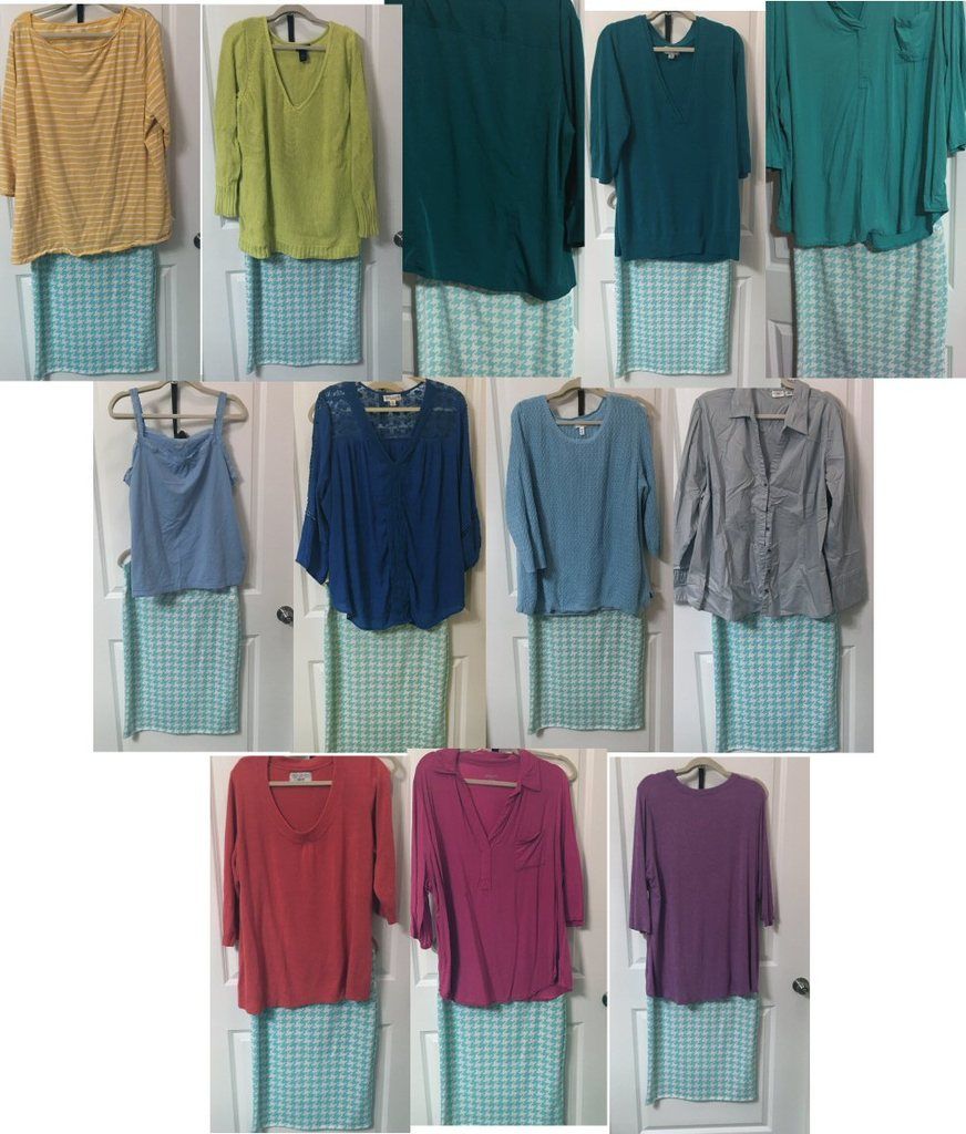 I found some more tops to pair with the skirt as color references (most of these tops I would never wear with that skirt, and a few I actually dug out of my donate bin just to get the color sample). http://i1123.photobucket.com/a.....20tops.jpg