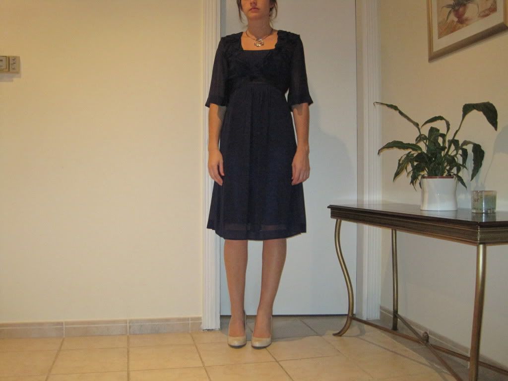I bought this dress in the monsoon sale the other day. My thoughts at the time were, classic style, not black but very versatile, possibilties for dressing up and down. Now I am not too sure. As always my problem with this shoo is that I am between sizes. The top layer of chiffon seems a bit too big on me FRUMPY?!. So to return on not to return that is the question?! I think I have already made my mind up would value some honest opinions. Thanks in advance.