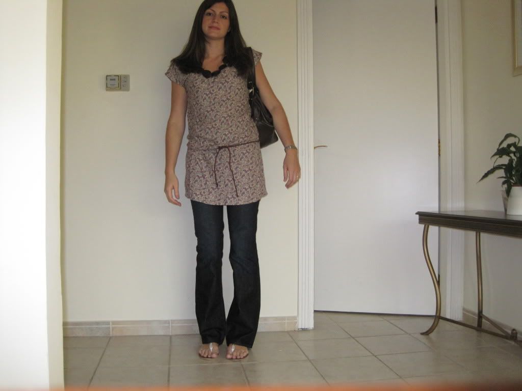 I bought this tunic top from Pull and Bear the other day. This is the first time I have attempted to wear it, I first tried it with leggings and my legs looked slimmer and not as bulky but I am thinking ithe tunic is too short. I am now wearing it with my Gap jeans, does this look ok or or they too baggy for the top, does it look a but frumpy?