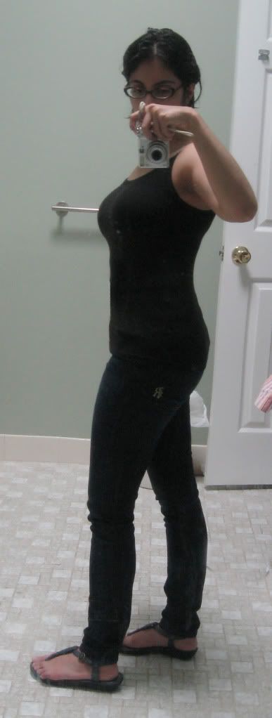 Today while I was getting dressed, I put on my skinnies and a cami (to be topped with a sweet pea tunic). Usually I avoid looking in the mirror until I have the tunic on because all this tight clothing emphasizes all the wrong things, but today I was surprised to see...well, nothing. I have been feeling that in how I dress lately too. I have been focused a lot less on constantly trying to cover my tummy. I still don't have a waist (at least from the front) and it's hardly flat but it isn't as much of a battle as it was just a few months ago. It might also be because my hips have grown a bit (36 to 37 inches) which makes everything more in proportion.