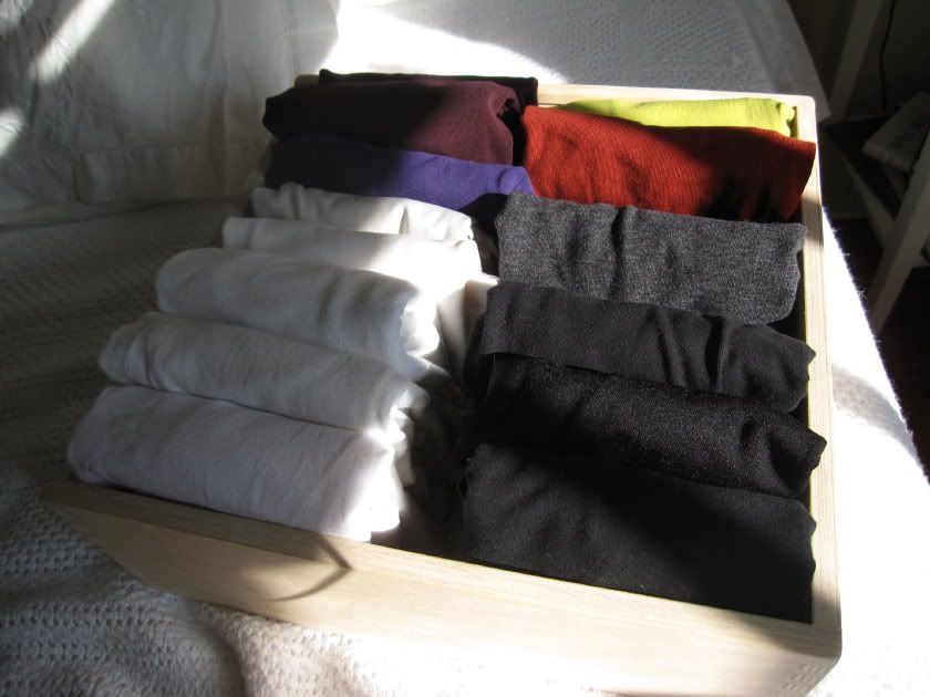 I use one of those hanging sweater shelf thingies with the vertical compartments, with all my underthings divided by type. All thin black socks go into one segment, black tights in another, gray or colored socks in another, and so on.
