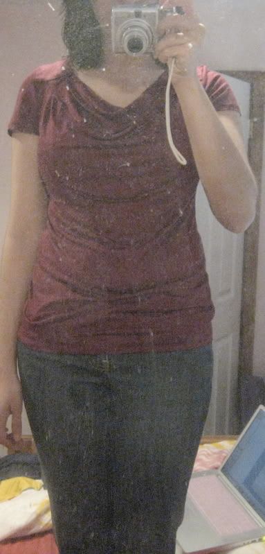 I love the way it drapes on the model, but on me it just doesn't flow the same way because of my chest. Instead of creating that beautiful ripple effect, it smooths out over my chest and then resumes the ruched/rippley look around my tummy. I read Angie's post on this subject (which is where I found this shirt), but I'm still not sure what types are best for the well endowed. I thought this would be good since the neckline is fairly scooped and low, but maybe it isn't, or maybe I need to go up a size...but even if I did get the ripple effect, I don't know if it's going to look all that great.
