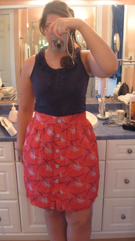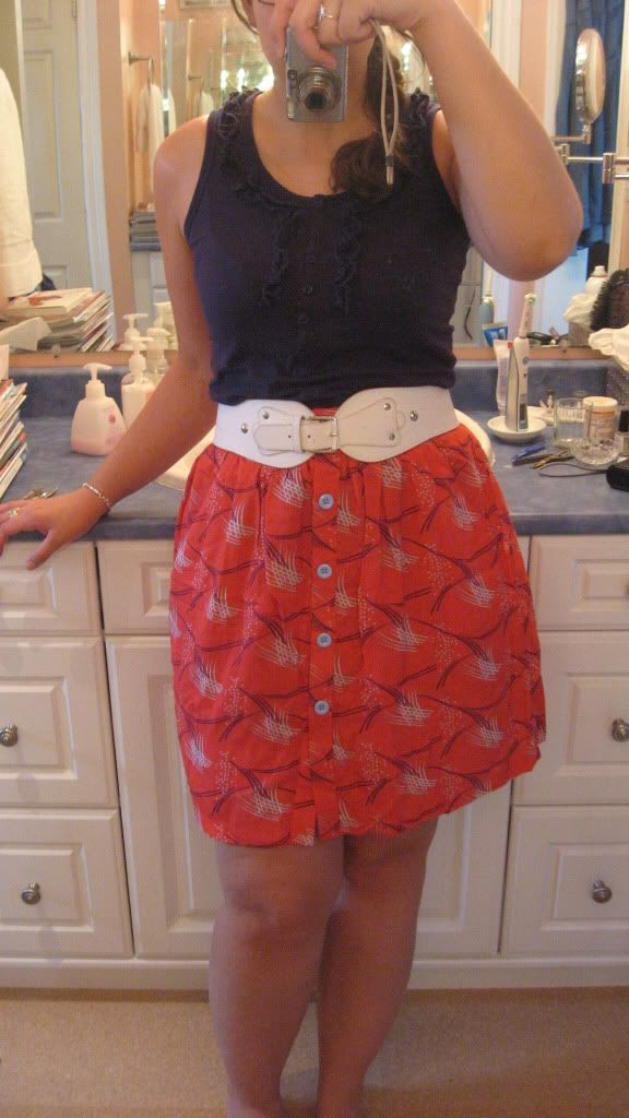 Hello YLFers! It's been a long time since I posted pictures on the forum- I've generally been feeling confident in my ability to dress myself reasonably well, but I do still read the forum and the blog daily. Today I'm finding myself indecisive about a recent purchase and am hoping you all can help me make a decision. I ordered a high-waisted skirt from an online store, which is always a gamble. I was unsure if a high-waisted skirt would work on my body type, but I thought perhaps if I stuck to fuller skirts it wouldn't be much different than wearing a dress that's waist defining. Now that the skirt has arrived and I've tried it on, I'm worried that it makes me look too hippy (I will always look hippy, but I do try to wear clothing that somewhat minimizes this area). Here is the skirt: