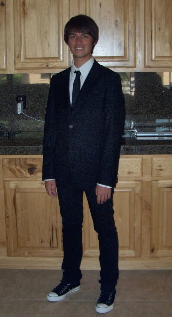 I'd asked for some help recently to find a slim cut fashion forward suit appropriate for my 17 year old. You were very helpful in suggesting Zara and H&M, and those styles were spot on, but we don't have those stores in Phx. Express was great, but we couldn't find anything small enough for him. As we walked out of the mall, through Nordstrom, we decided to look at the young men's section, and they had a black jacket on anniversary sale, at a very good price. It was a European brand and ran quite small, so with some tailoring we were able to fit him. Here's the end result -- and he's ready for his senior picture on Tuesday. Thanks for all the helpful suggestions.