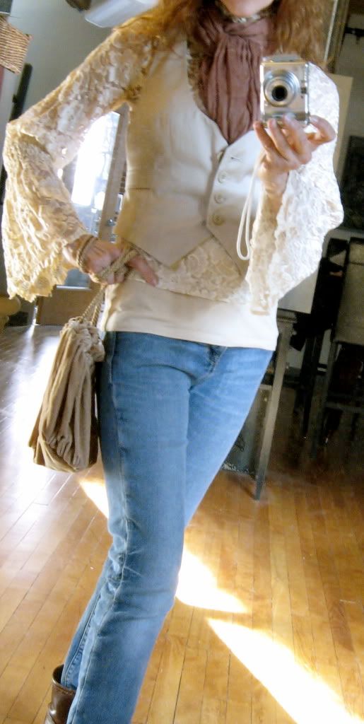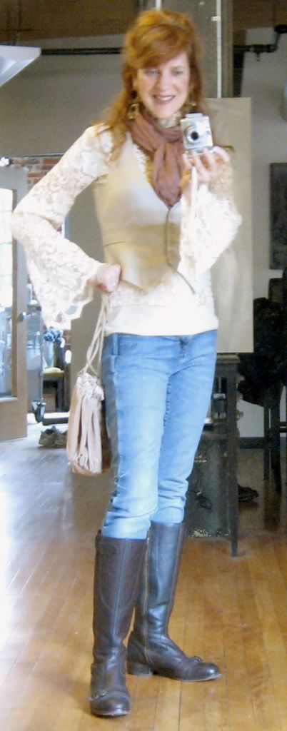 the title of the picture is "house outside." in an overgrown field (tall grasses, wild flowers), old, abandoned furniture has been scattered, like it's been thrown out. to the right of the frame, there is an old, weathered couch, cushions a little displaced, showing the white underside of the seat beneath them. there is a white cloth -- a towel, maybe? -- draped over one arm. in the center, two girls are perched on an old cupboard. the right door is swung open, and one of the girls is resting her foot on it, the other on a brick on the ground. she has long, dark blonde, wavy hair, and is wearing pale tan western-style boots with fringe along the sides, with a short, sleeveless cream dress with a ruffle along the bottom trimmed in a darker color. the other girl has dark hair and is wearing black shorts with a white off-shoulder top -- her bare feet are resting on the top of the couch.