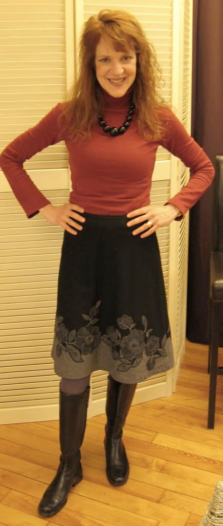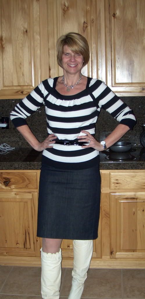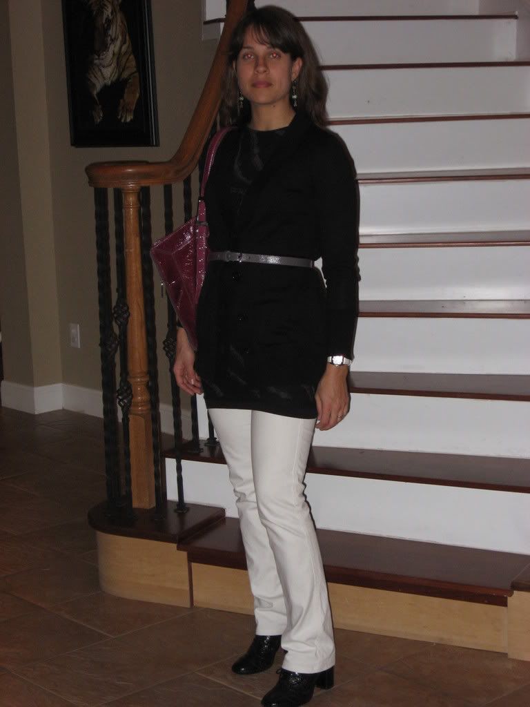 I am most comfortable in my work/yoga clothes. I feel like they fit well and suit my body type. However I am aware they're not suitable for running errands and social events. I really don't know what suits me though. My closet is full of empire waist tops and floofy dresses and baggy pants and knee-length peasant skirts, all of which are unflattering. I feel like I look especially awkward in boatnecks, stripes, (okay, and patterns), turtlenecks, scarves, belts, short tops, knee-length skirts, long skirts, anything that doesn't have a super-defined waist or is the least bit baggy. And I have this bizarre notion that collars make my head look even more pinhead-y. Oy, who knows?