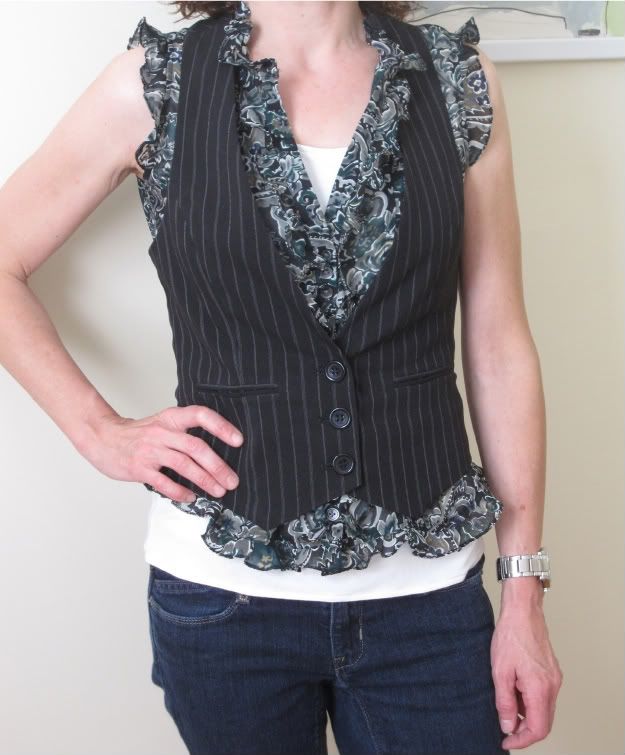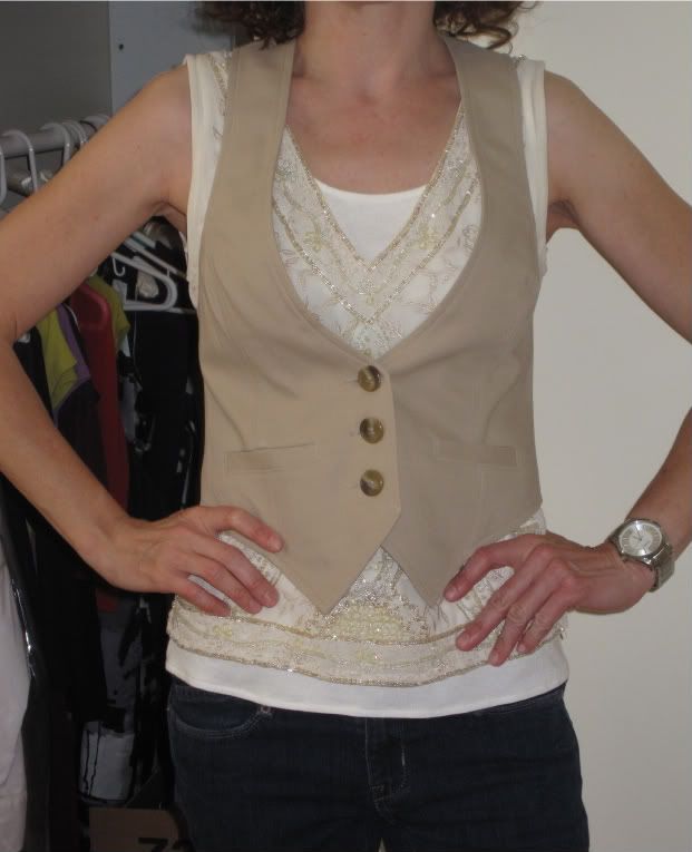 Susand - I'll post when I get a chance to take a photo. The back is pretty simple - it's just black satin material. My black vest (you can see in that album if you click through) has a white satin back, with a black pinstripe. That makes it a little more challenging for coordinating outfits, but I also have it in my head it makes it okay for summer. I would love to get one of those vests that are essentially backless - kind of like a halter style? I don't know if it would be flattering on me, but I'm intrigued by the idea. Might be a good look to tone down my shoulders. Or it could look awful...