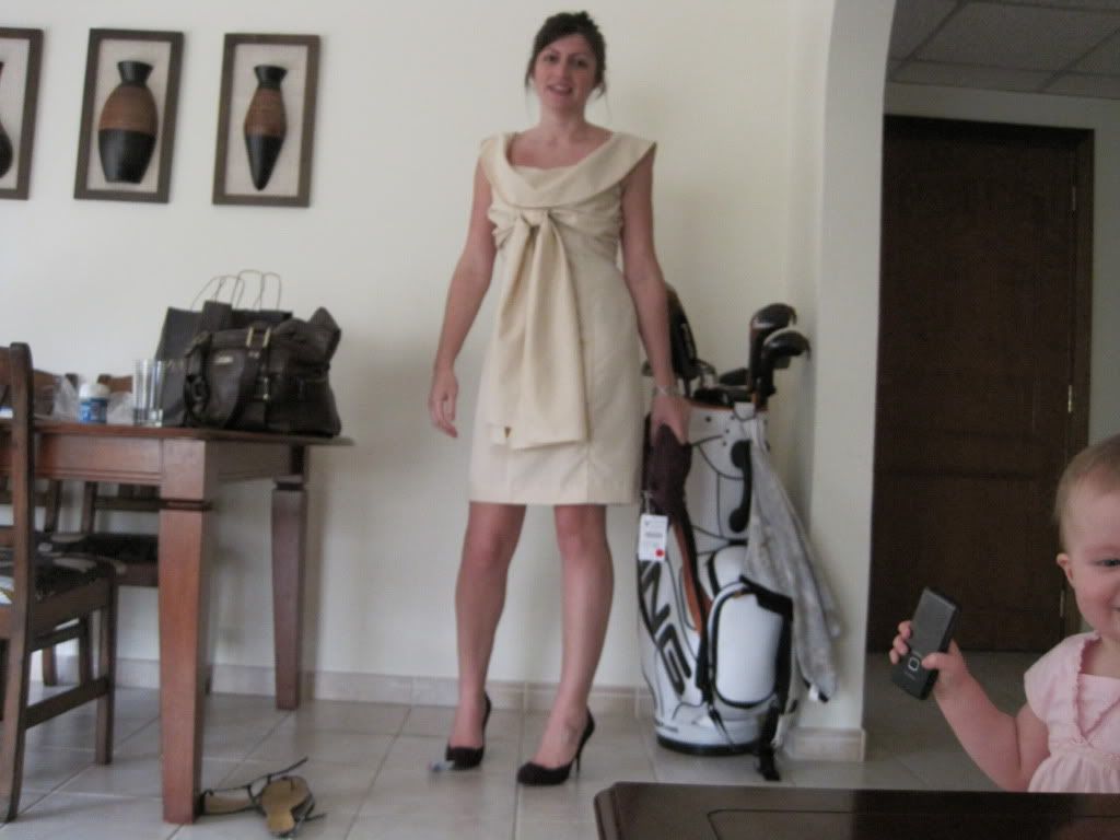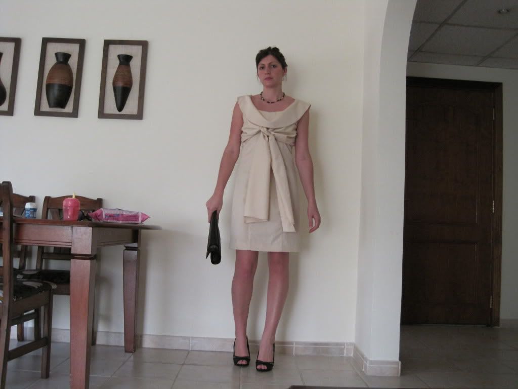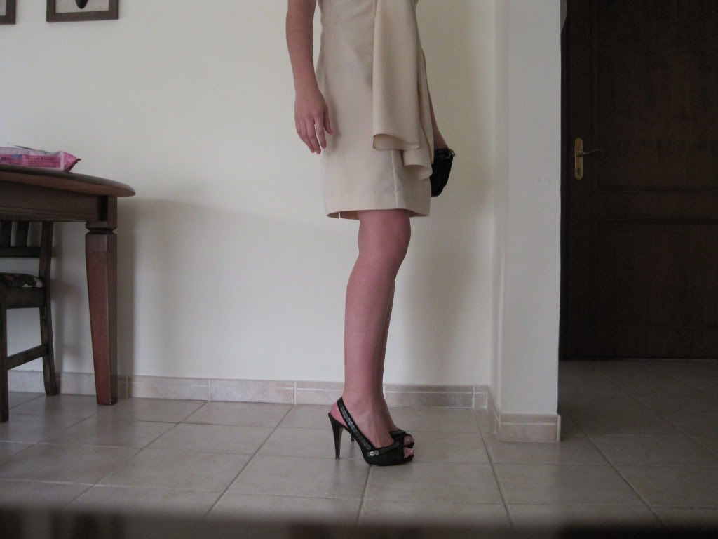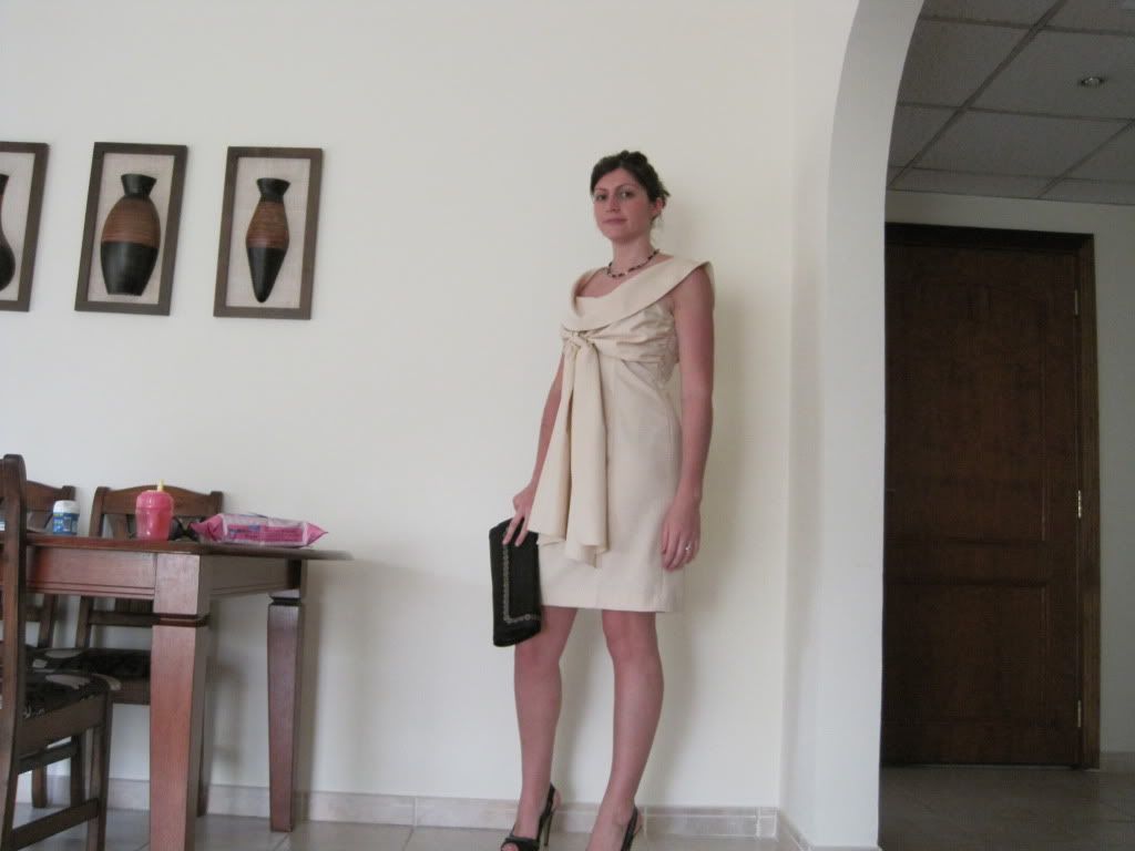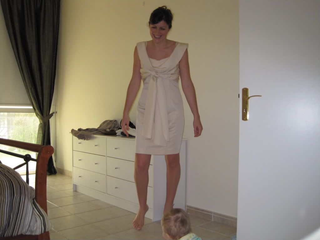 I am going home in 3 weeks time to have my daughter christened. I have just had this dress made (copied from a Ted Baker one I bought earlier in the year). The colour does wash me out slightly but I will have 3 weeks in the sun before the big day and am sure to have a decent tan. Anyway getting to the point I have no idea what kind or colour of shoes to wear with it. I have some nice gold strappy sandals but thought that perhaps something contrasting would be better or would a shoe rather than a sandal be best?