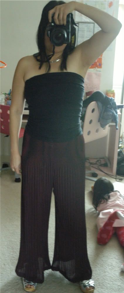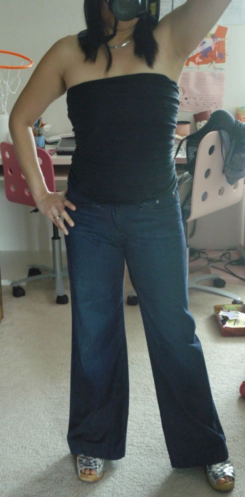 Then I saw the Soul Train video Bigi posted a link to, and that reminded me of the tube top + flares look. I normally don't wear tube tops (heh) but for the sake of costume I would, if it doesn't look too ridiculous: