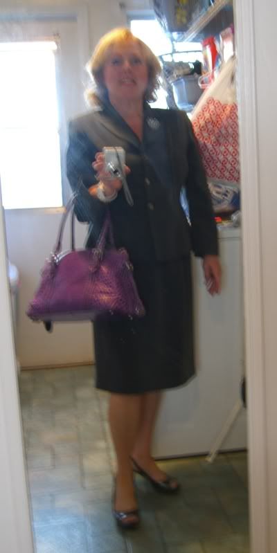 Today I am business super-formal. I like the scrunched-up sleeves better, but I think the purple bag is definitely better than the yellow bag. What do you all think?